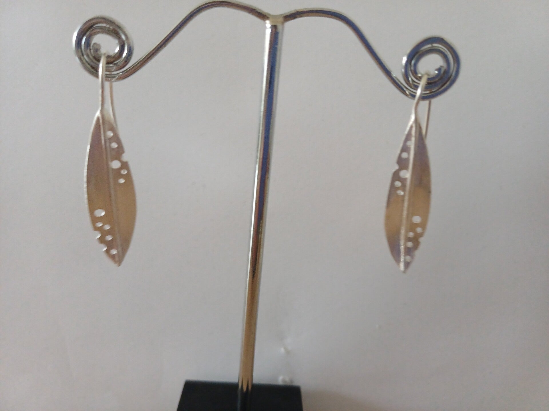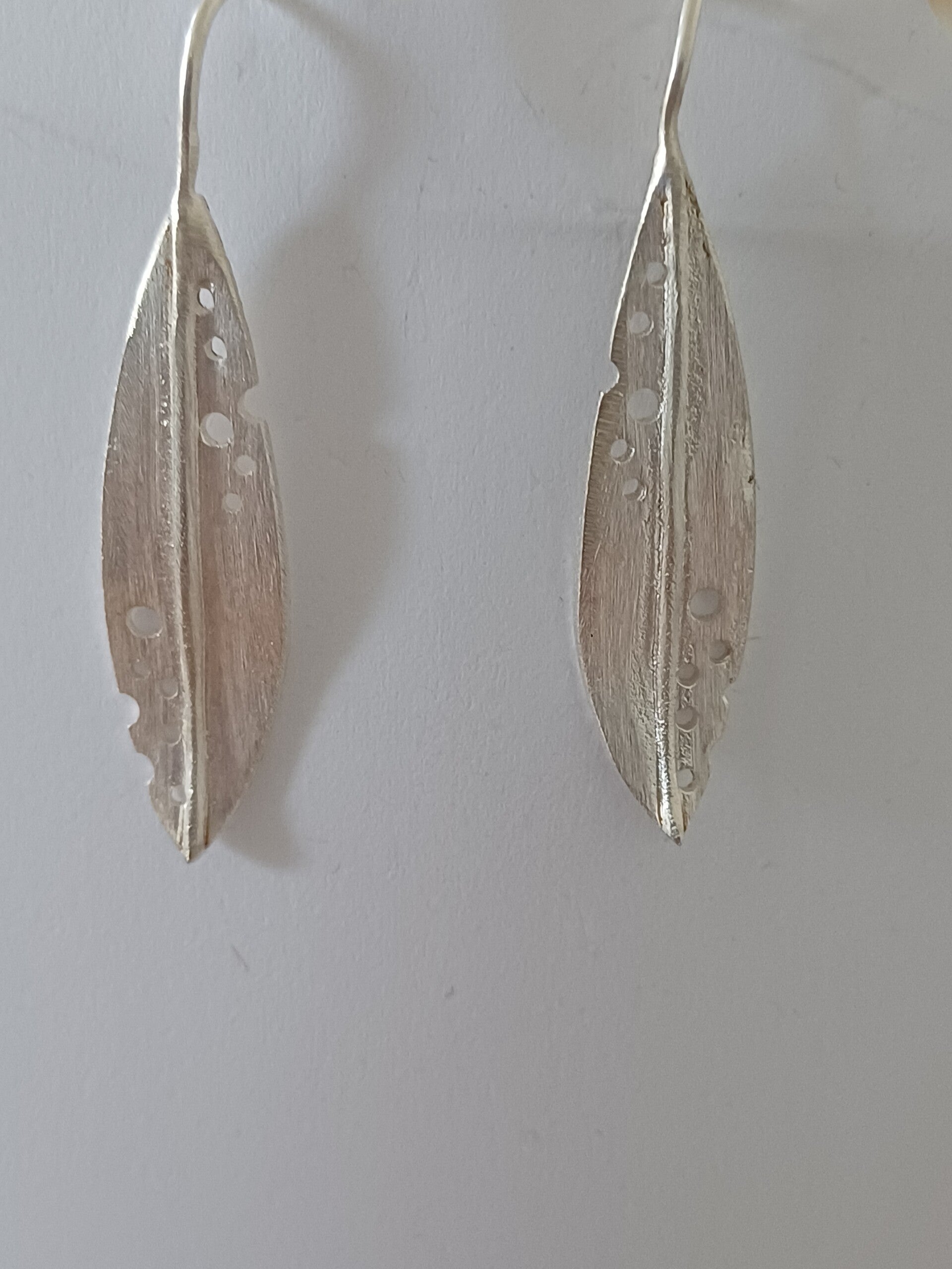 Mat zilveren oorbel met perforaties in een gestileerd ontwerp.