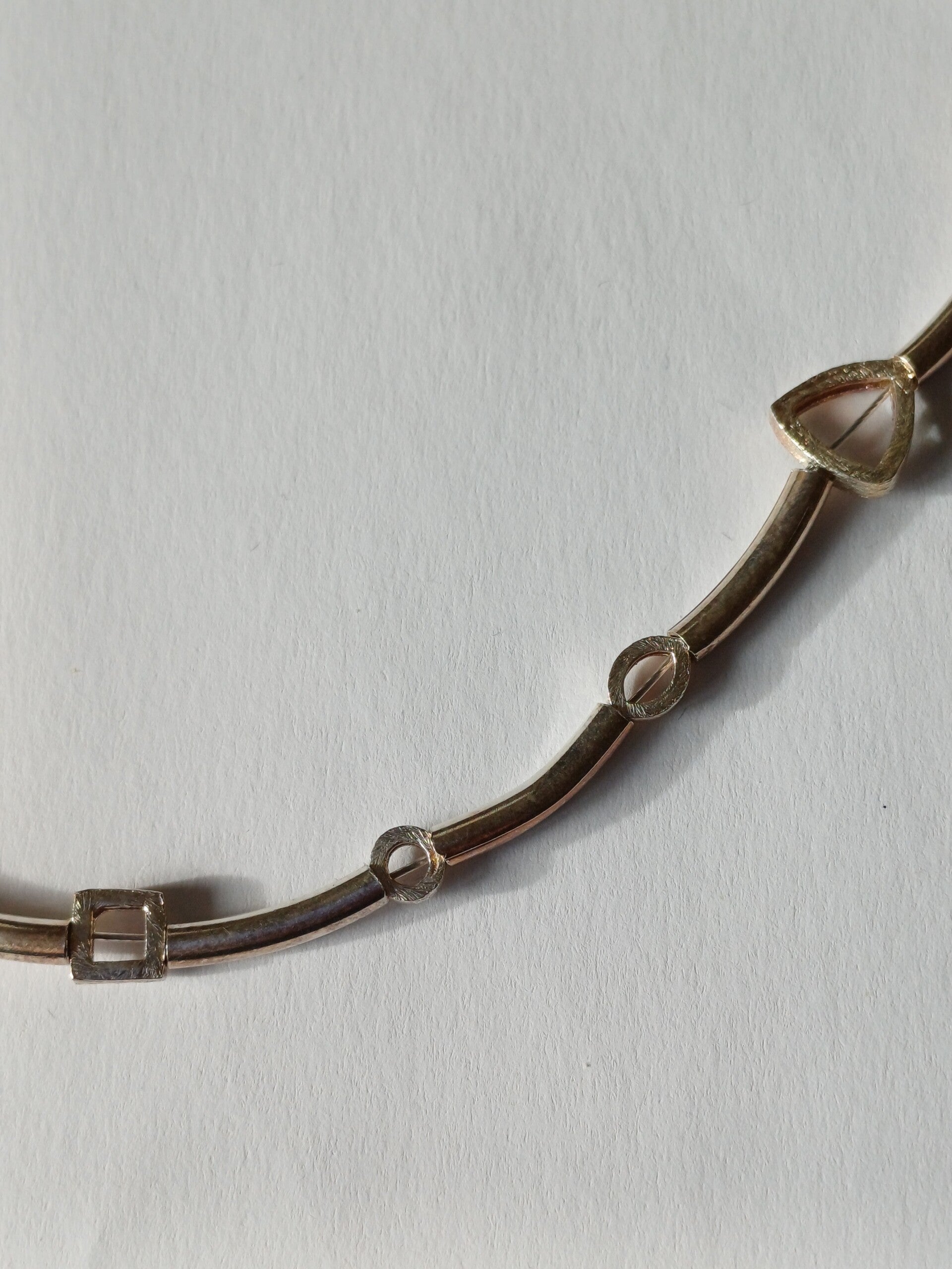 Kettig met zilveren tubes en geometrische figuren.