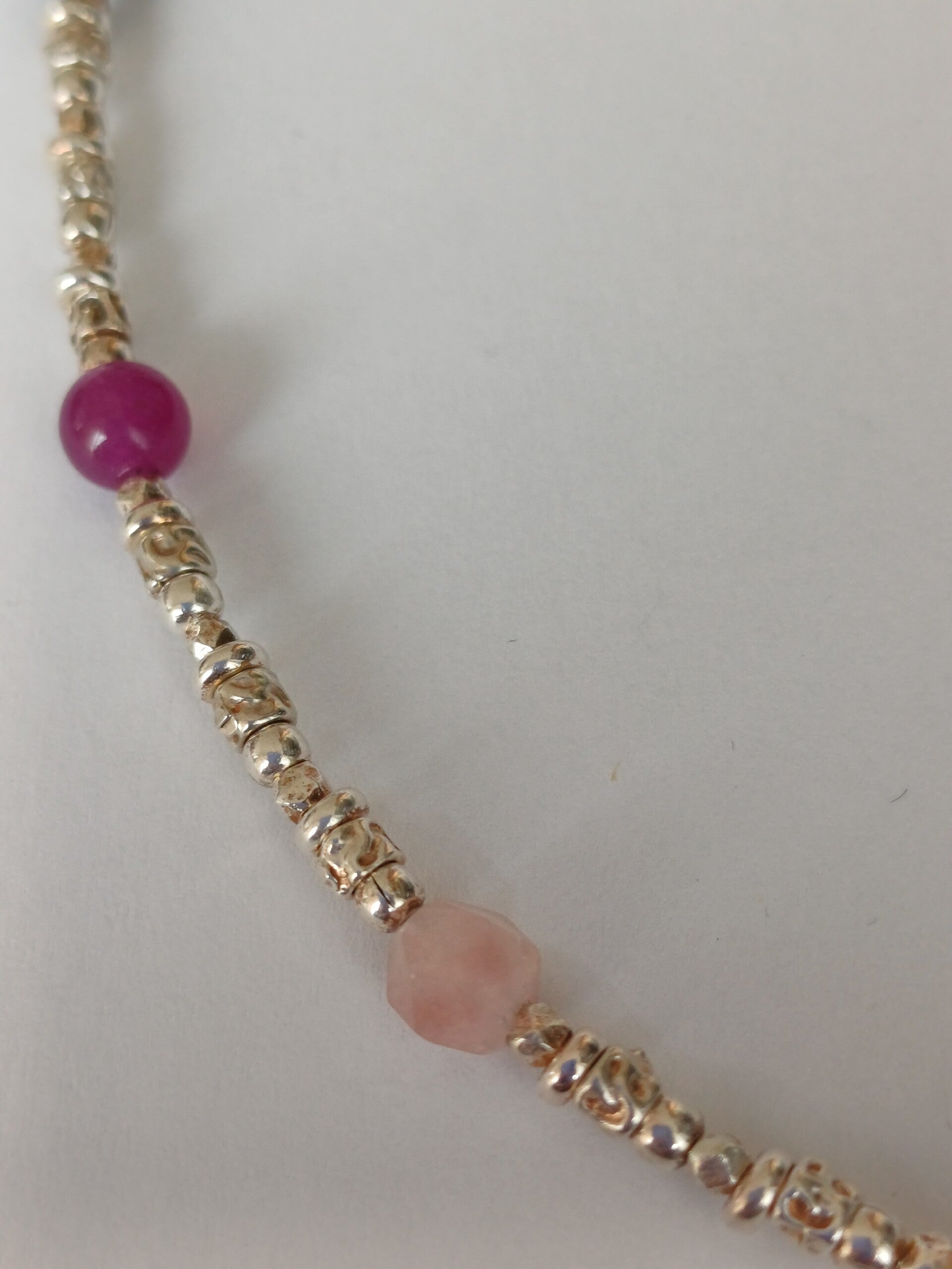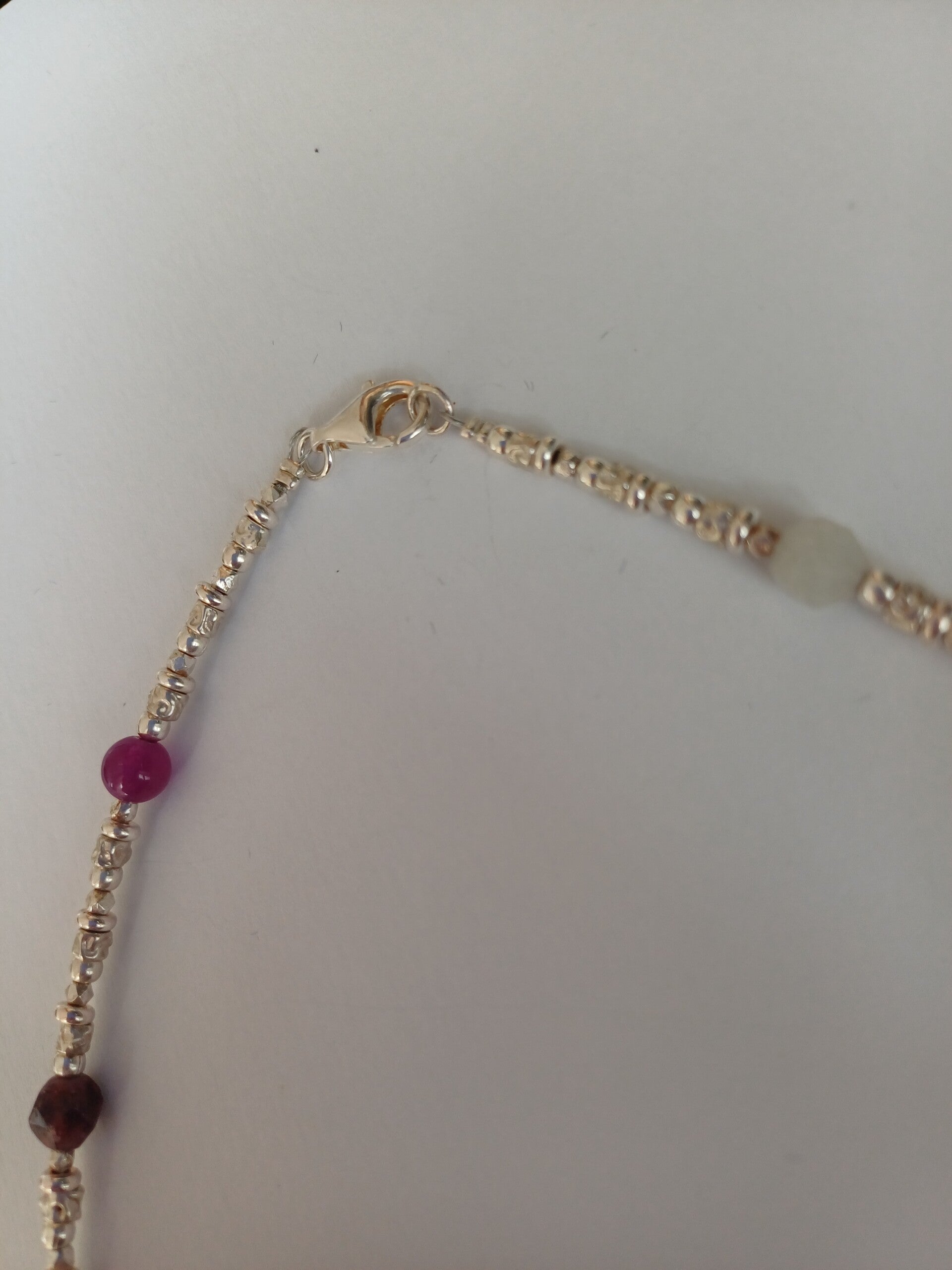 Ketting met diverse zilveren blokjes en veelkleurige geslepen edelstenen in pasteltinten.