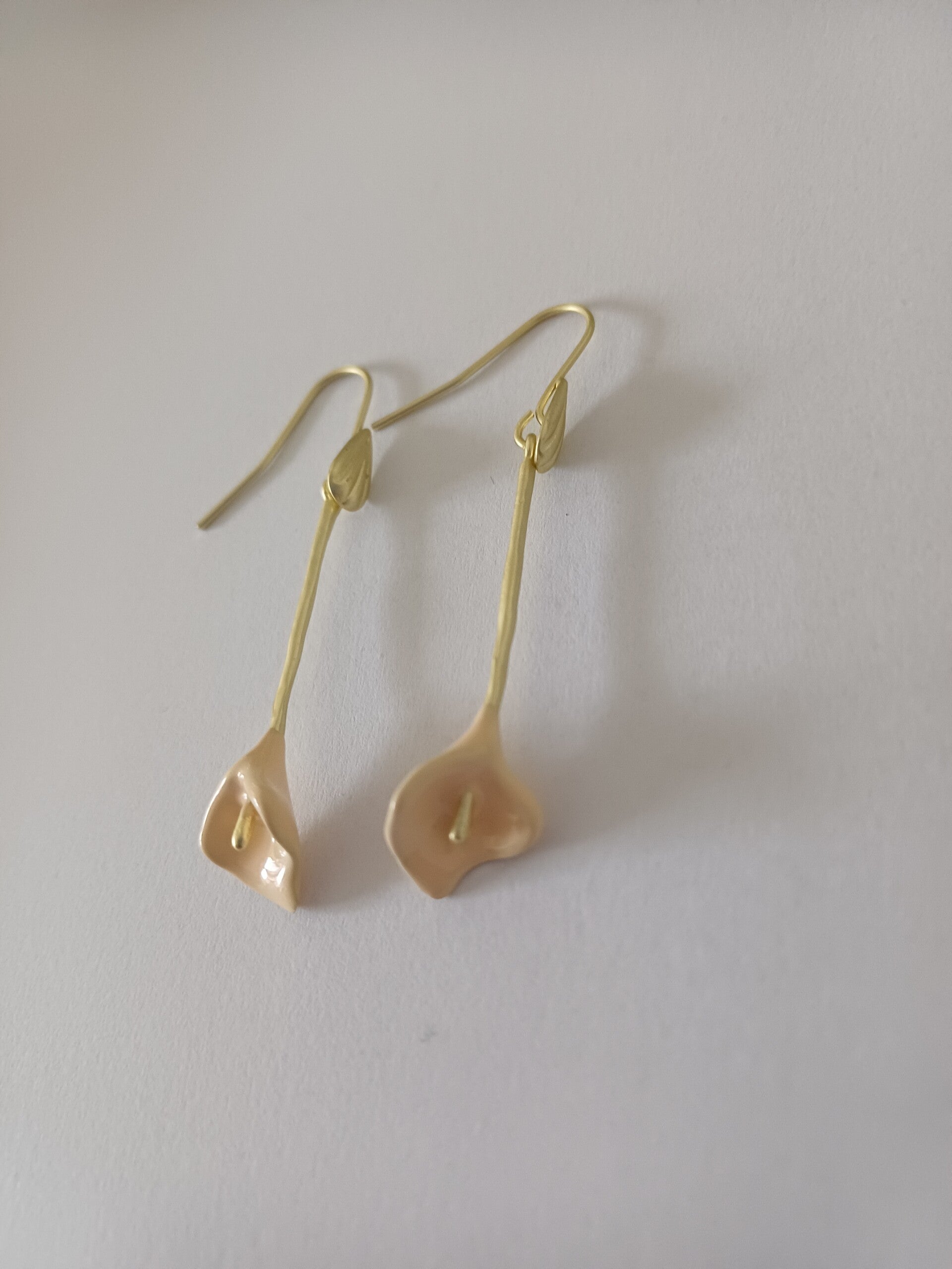 Oorbel mat verguld met lichtroze aronskelk aan open hanger met bladmotief.