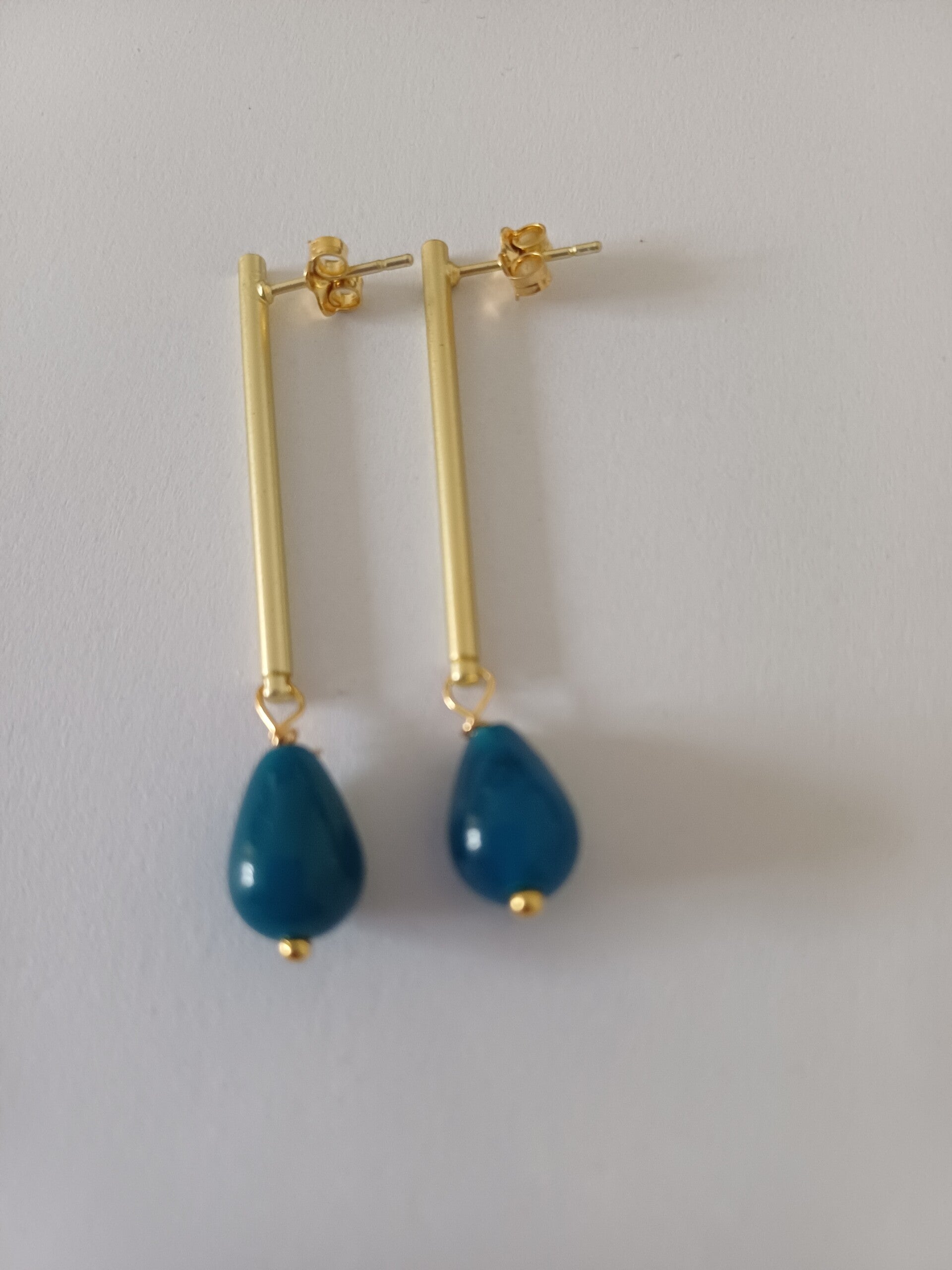 Oorbel in mat goud met fijne staafjes en daaraan geslepen labradoriet in druppelvorm.