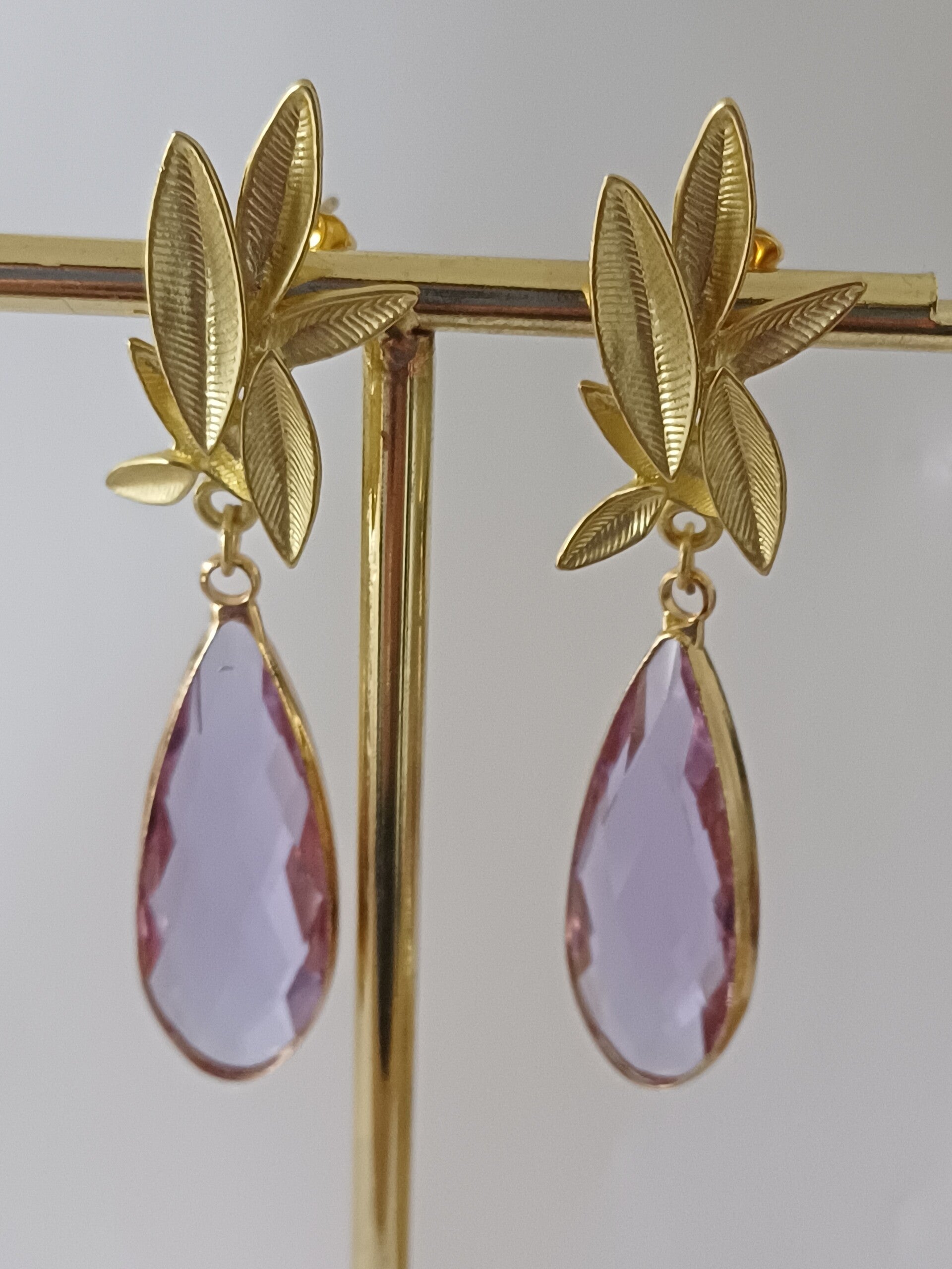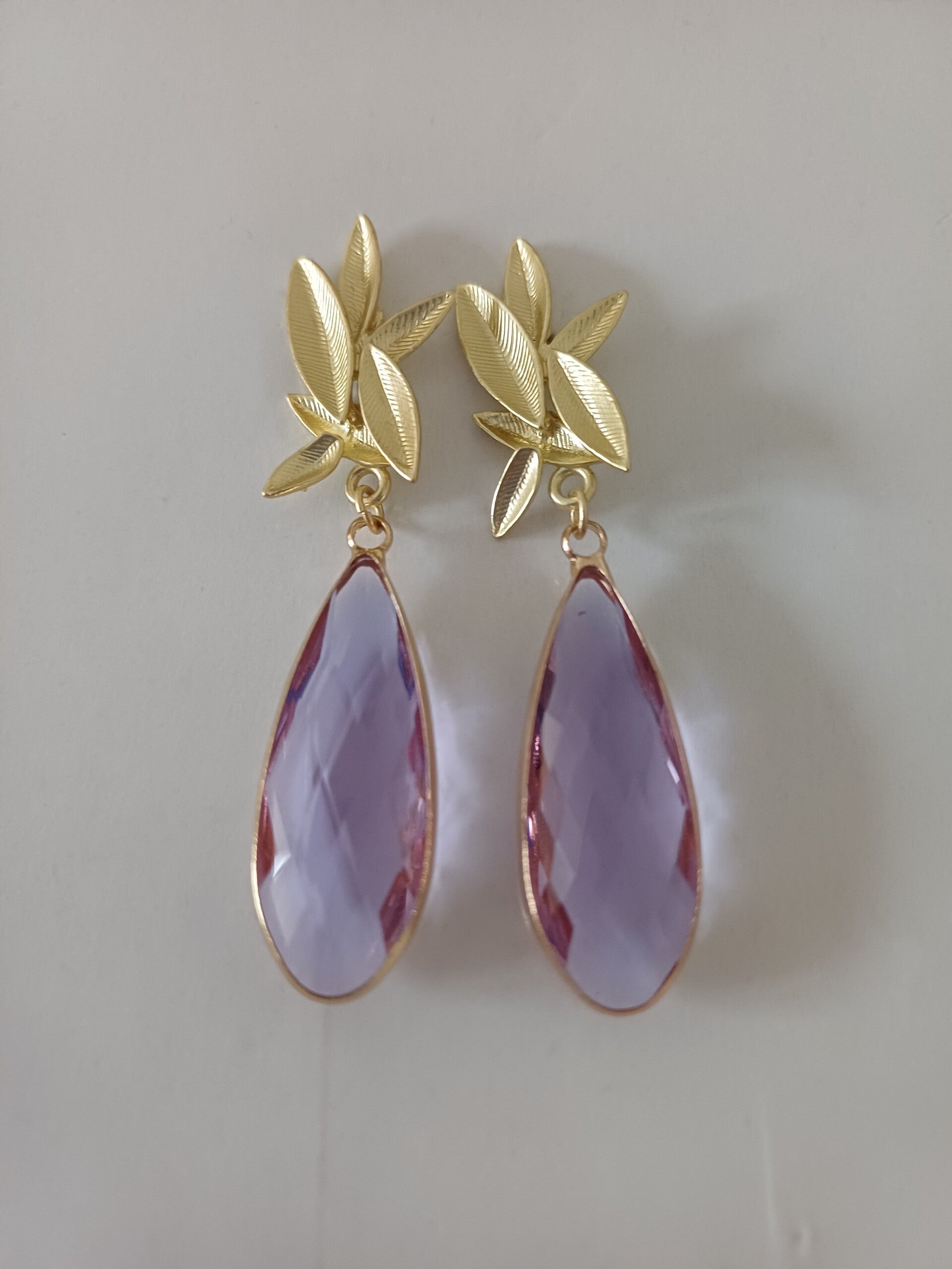 Zeer feestelijke oorbel met blad motief en daaraan grote lila geslepen kristallen in druppelvorm.