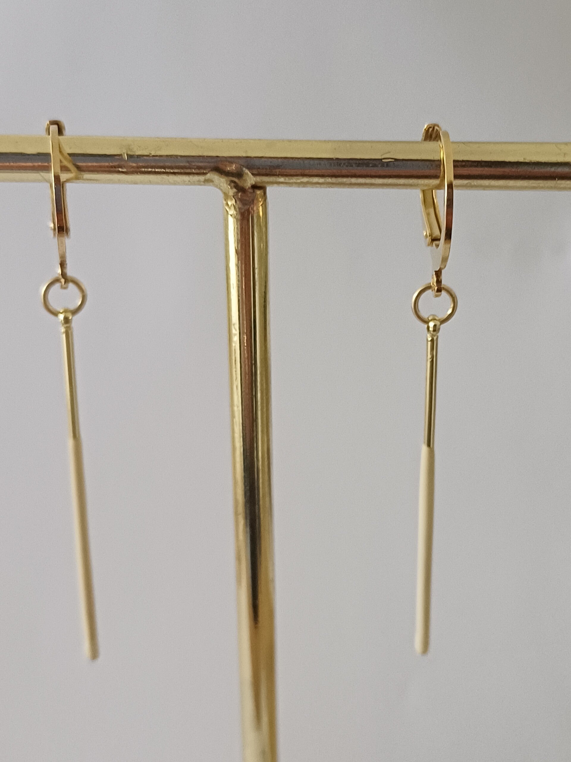 Lange rechte oorbel met fijn beige email staafje aan goudkleirig ringetje.