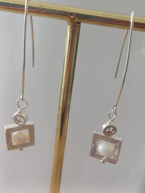 Zilveren oorbel aan open haak met vierkant raampje waarin een zoetwaterpareltje is verwerkt.
