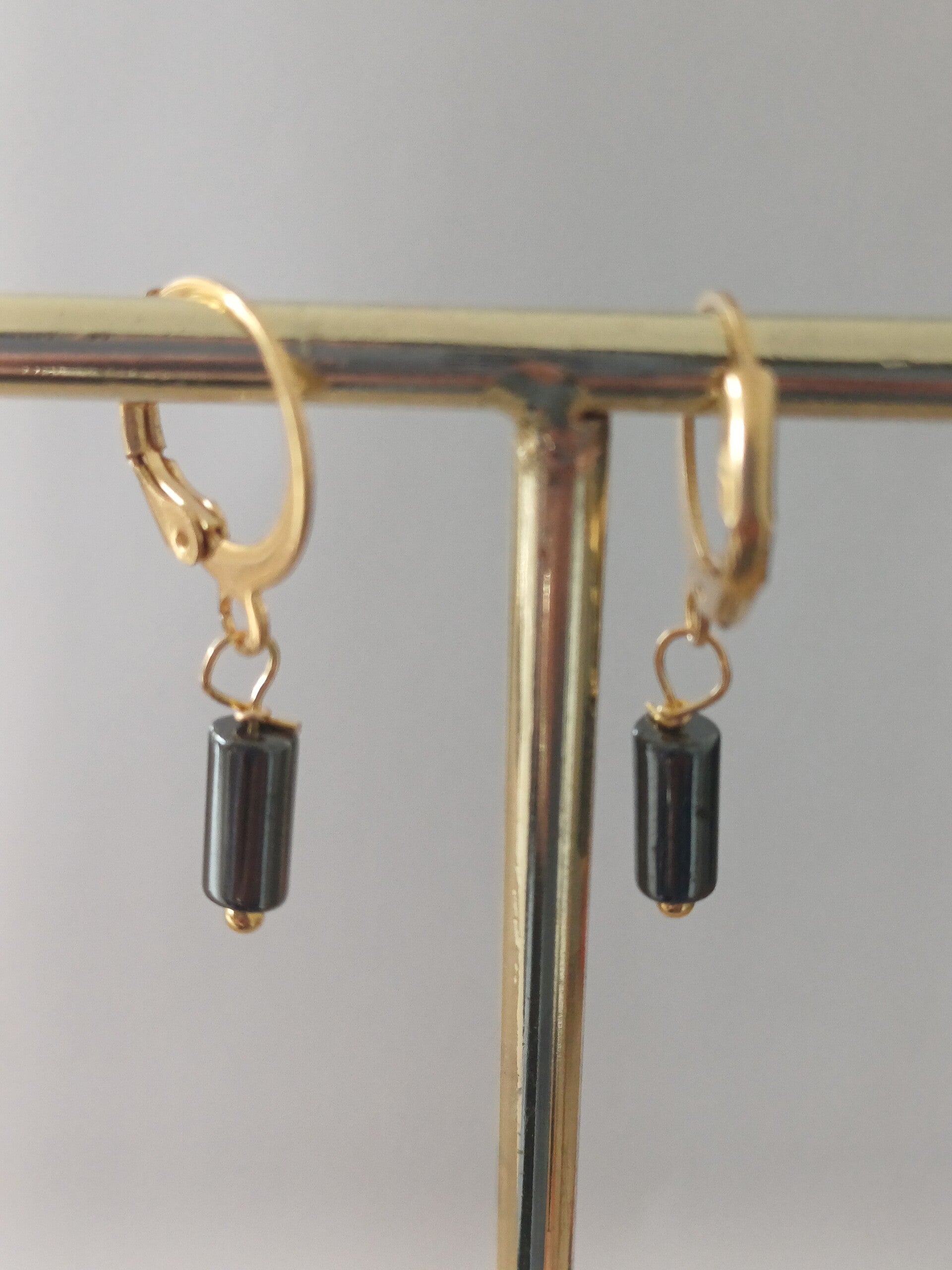 Een gold plated ringetje met daaraan een tube hematiet.