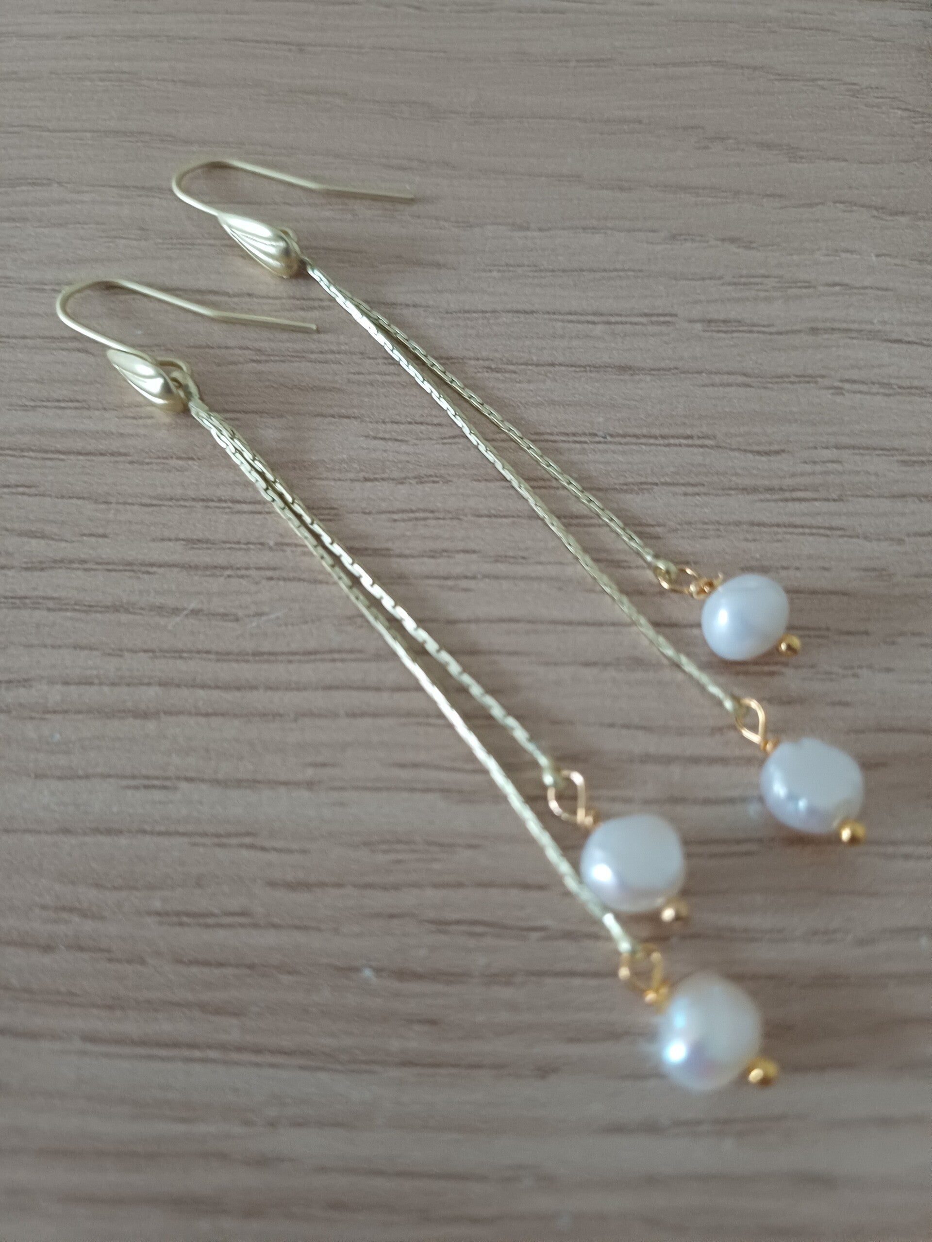 Lange oorbel in mat goud met 2 ragfijne kettingen en daaraan een zoetwaterpareltje.