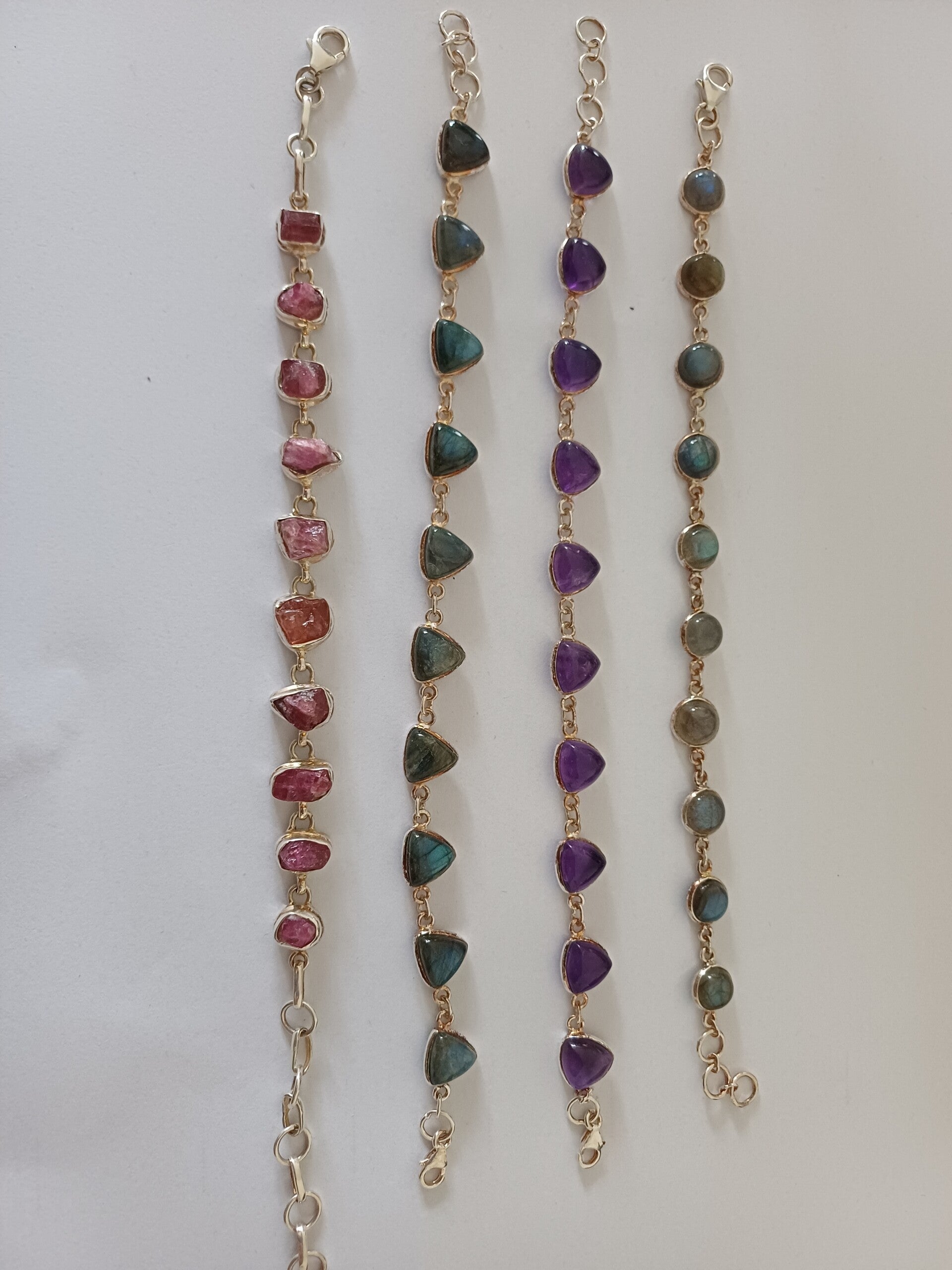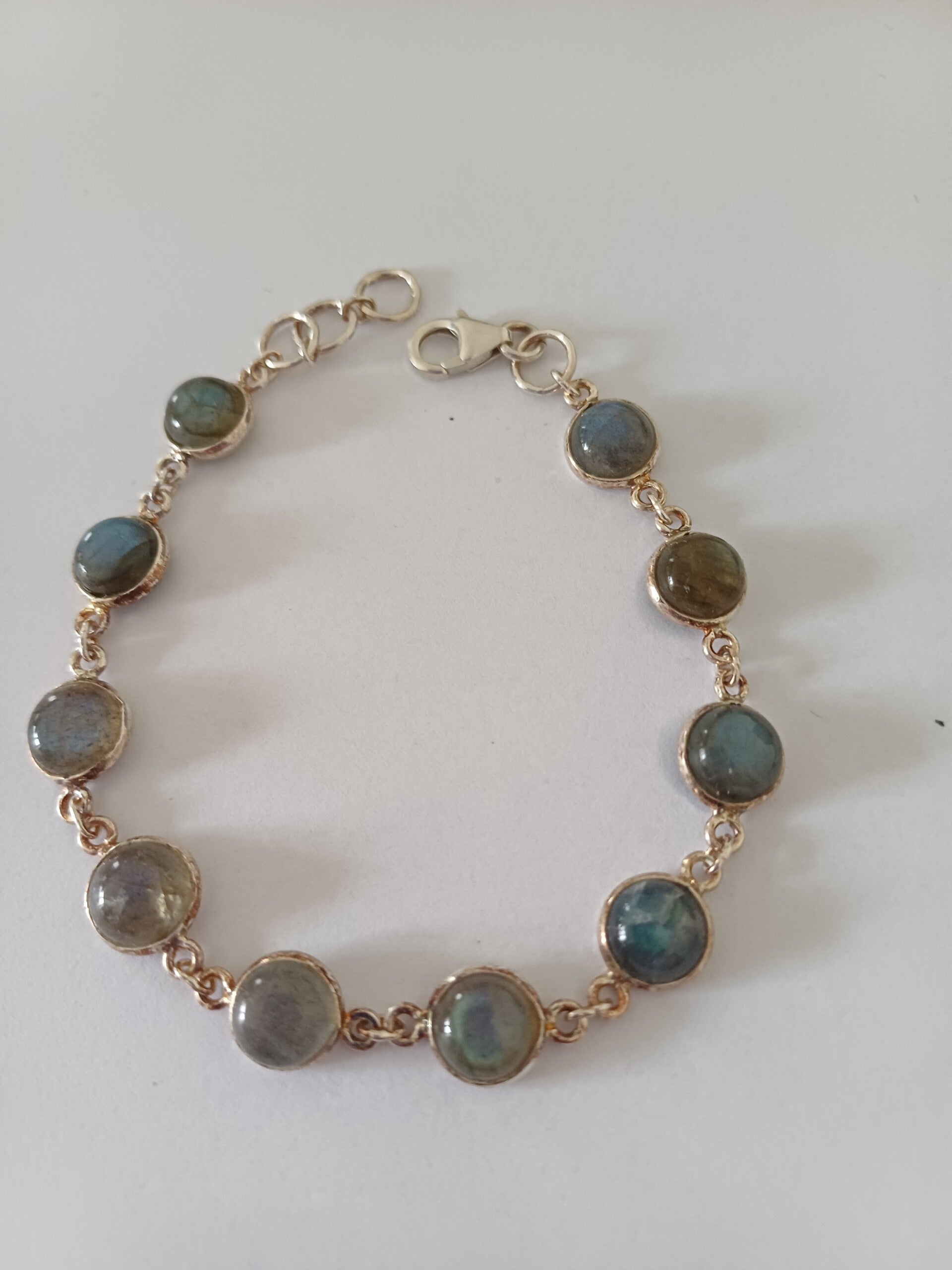 Zilveren armband met ronde labradoriet. De steentjes zijn in cabochon geslepen en gezet.
