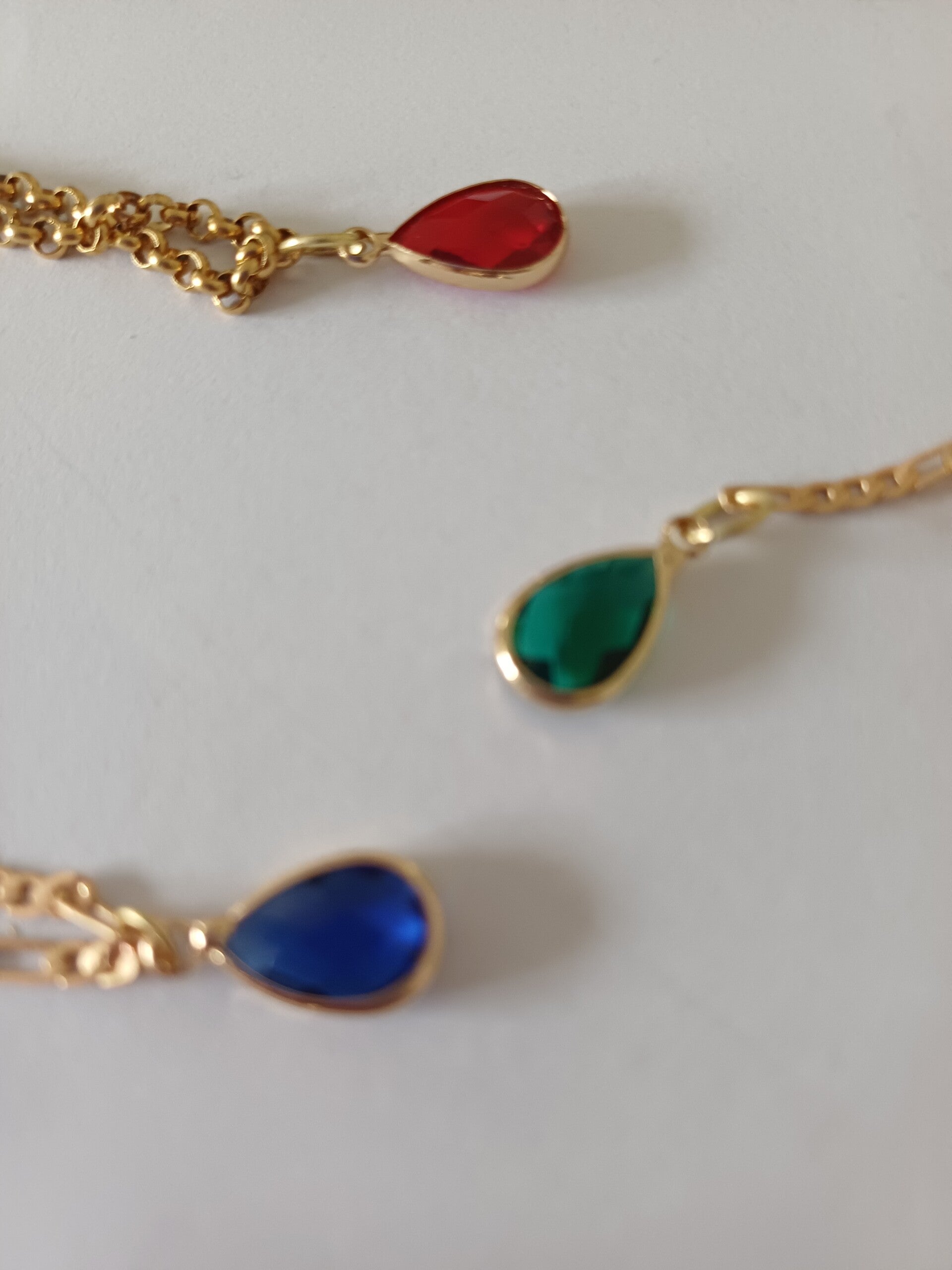 Verguld armbandje in gouden rollokettingmet een druppelvormige rode bedel in kristal.