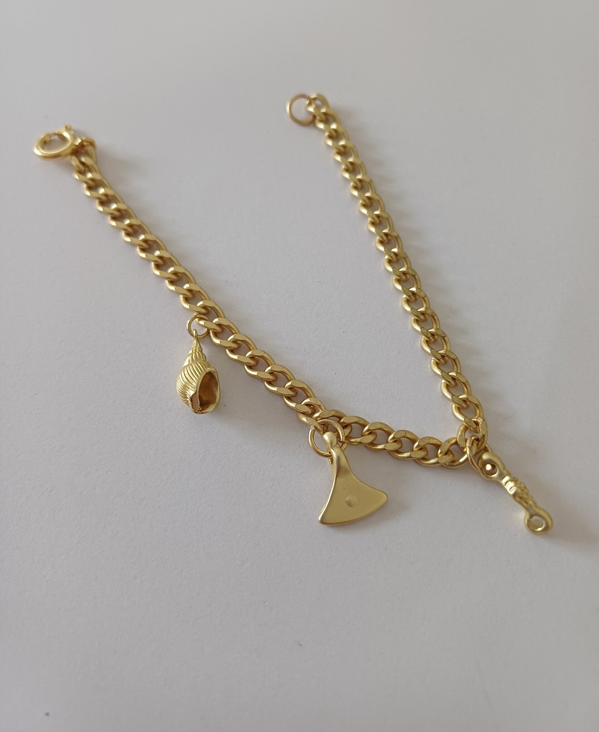 Mat vergulde armband met gourmetschakel en 3 bedels. Een slak, een driehoek en een ruit.