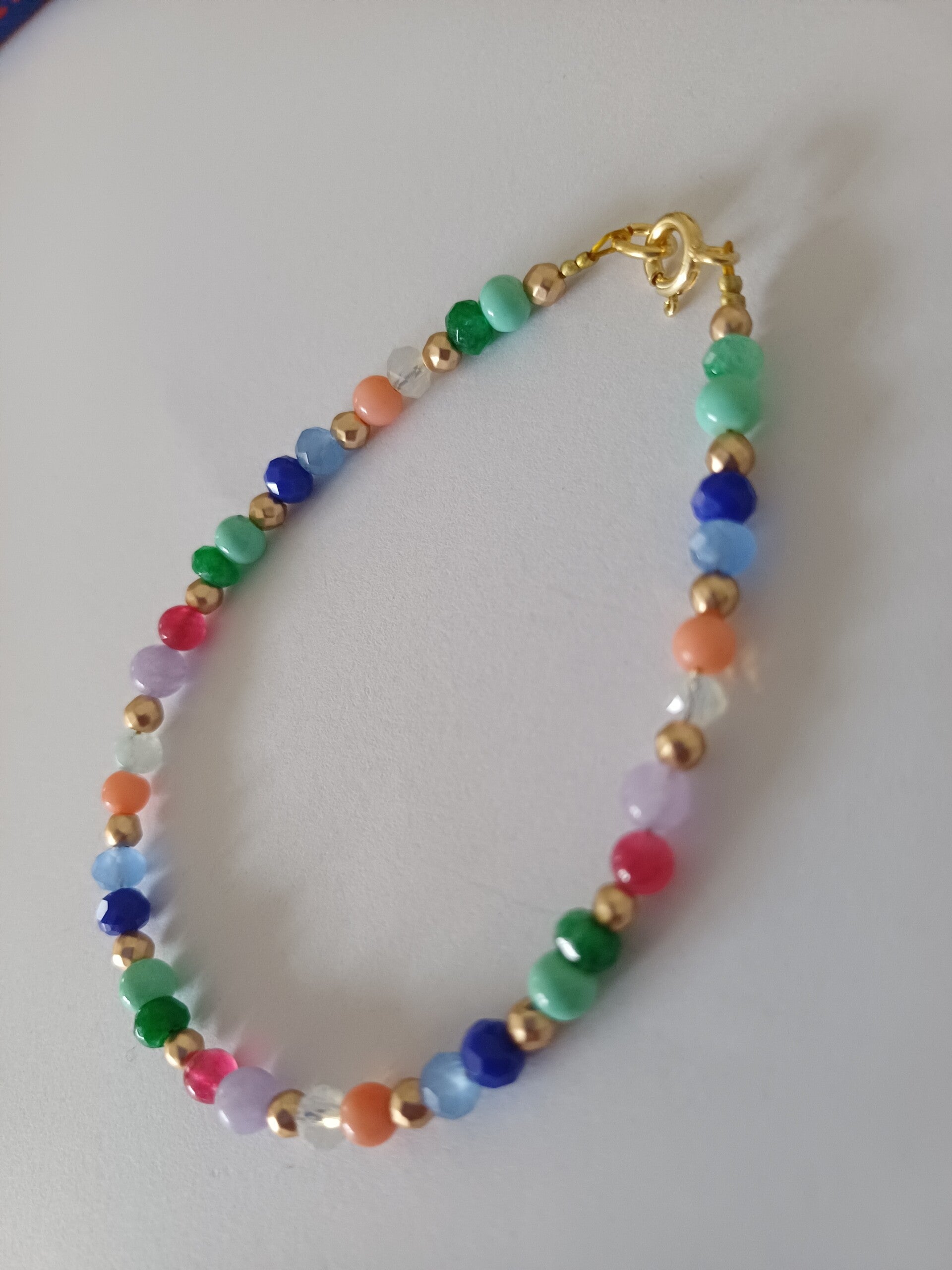 Armbandje met multicolore edelsteentjes, afgewisseld met bewerkte mat gouden tussenstukjes.