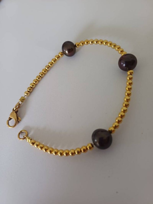Armband in vermeil ( goudlaag over zilver ) balletjes afgewisseld met 3 zwarte zoetwaterparels. Afgewerkt met karabijnslotje.