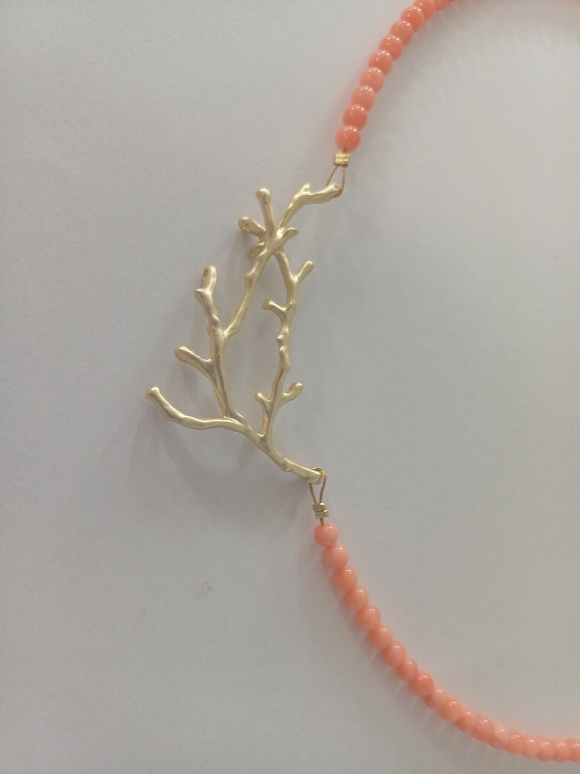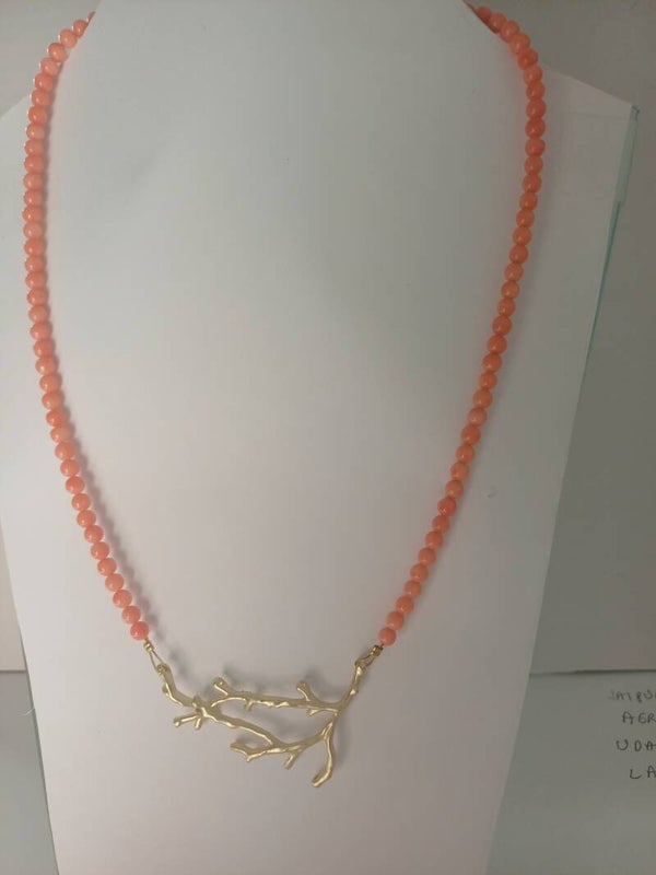 Ketting in kleine koraalbolletjes met tussenstuk in de vorm van een koraaltakje.
