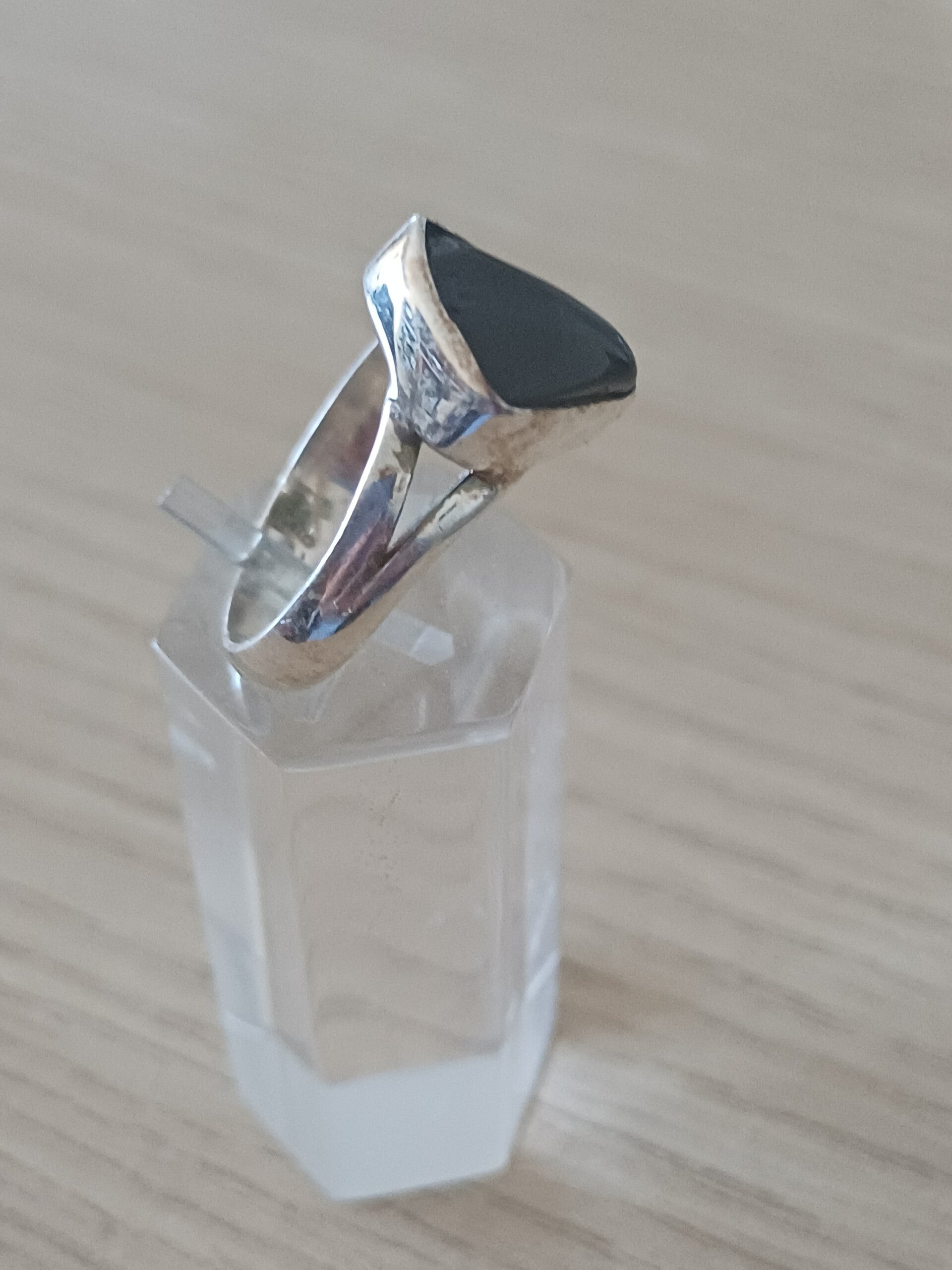Mooie zilveren ring met driehoekige onyx in verwerkt.