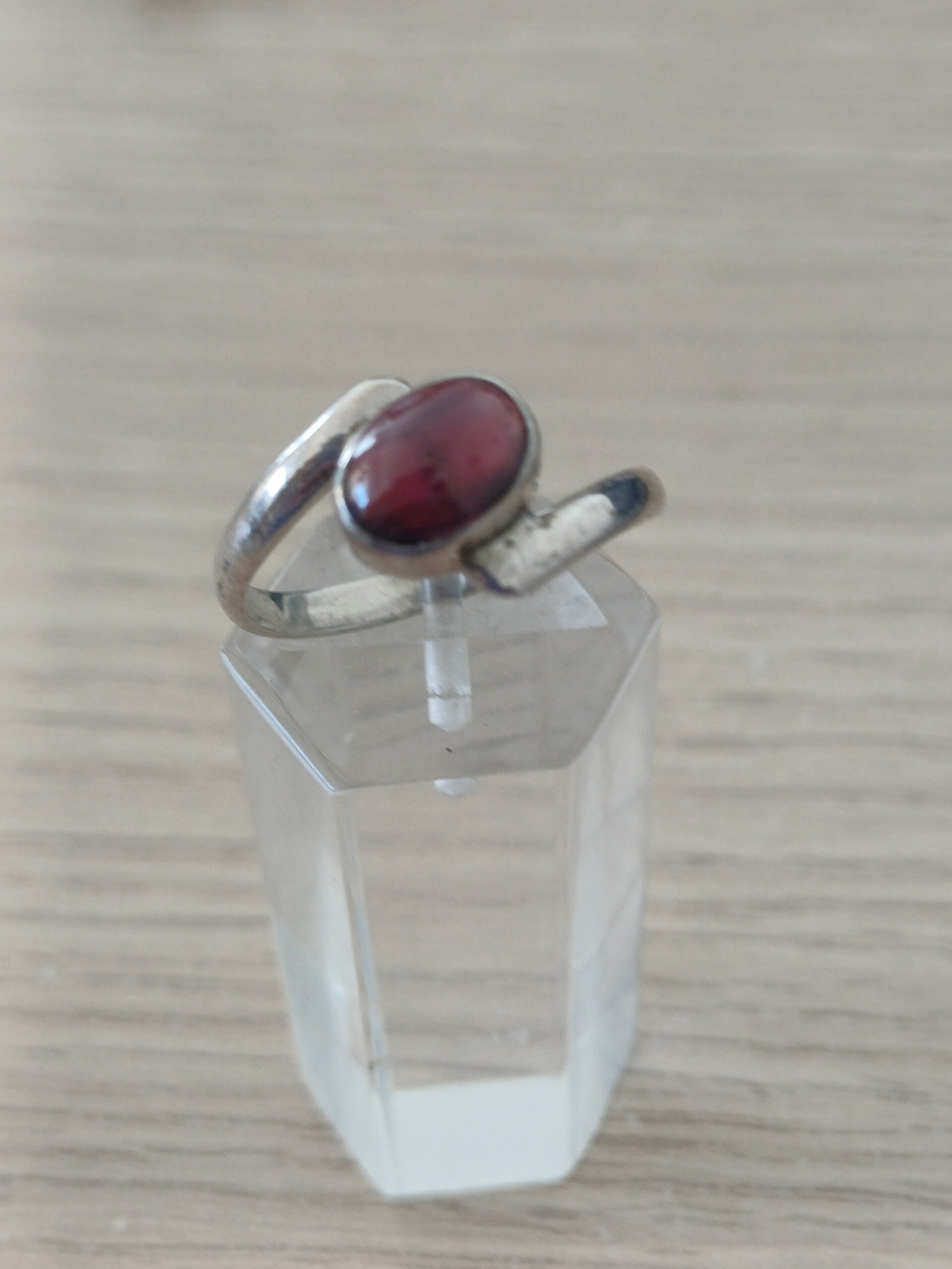 Leuke zilveren ring met dwarszetting en ovale edelsteen.
