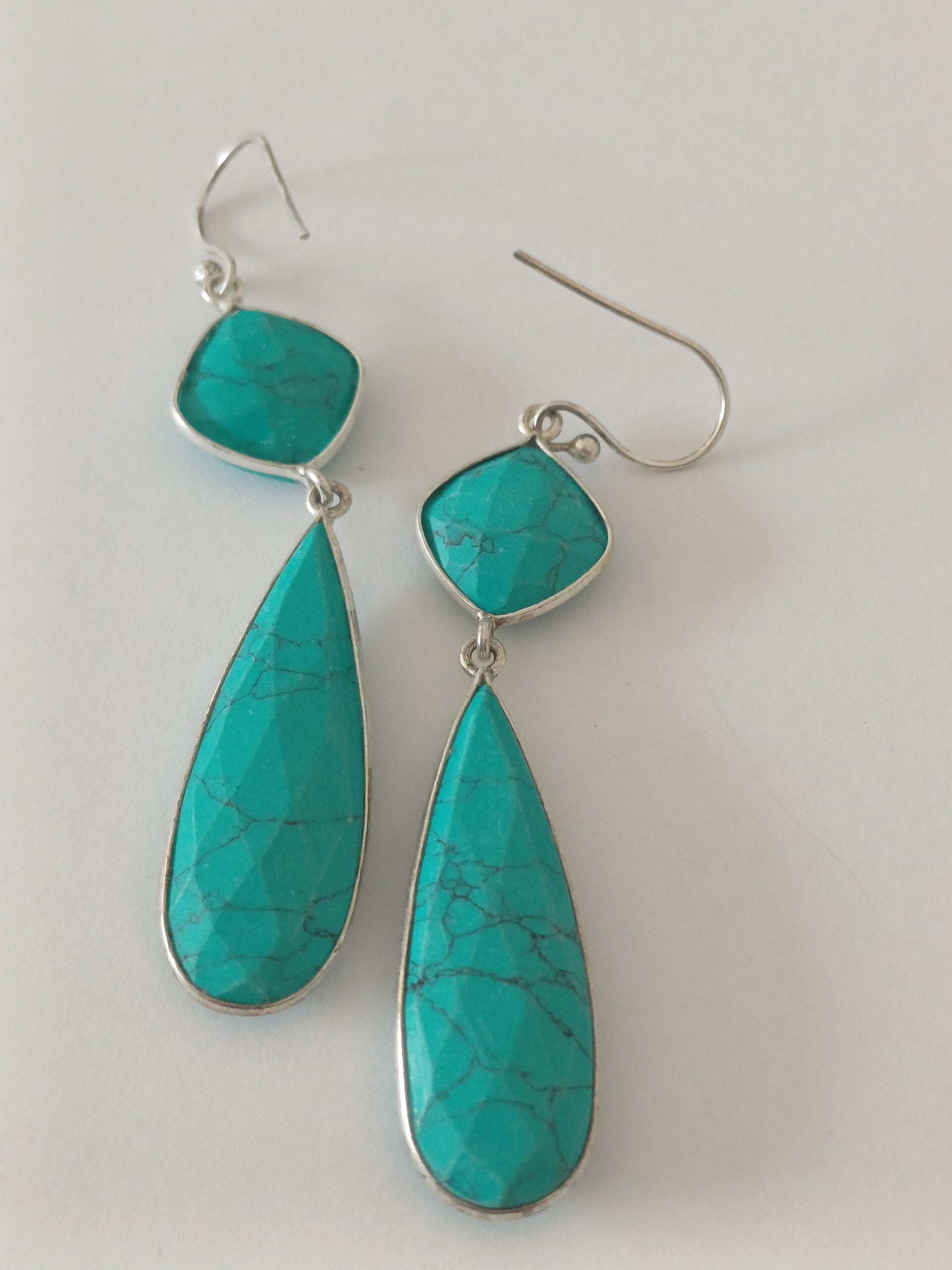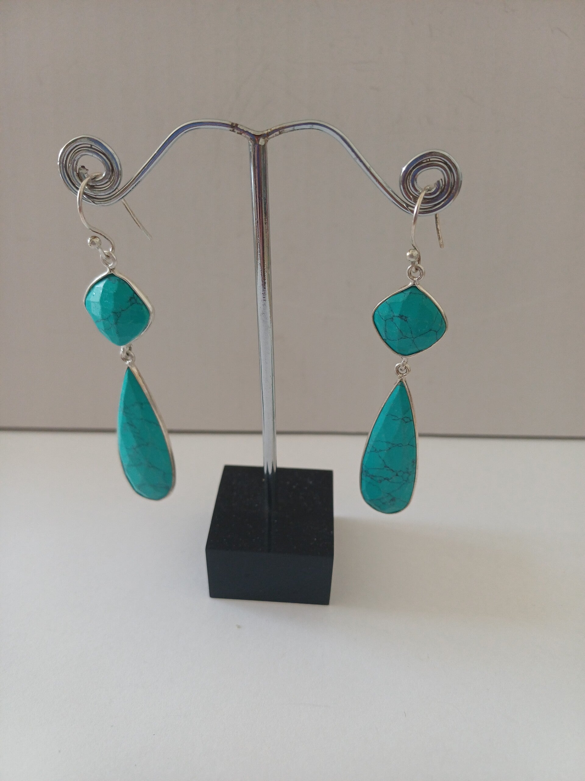 Imposante dubbele oorbel met turkoois gevat in zilver aan open haak.