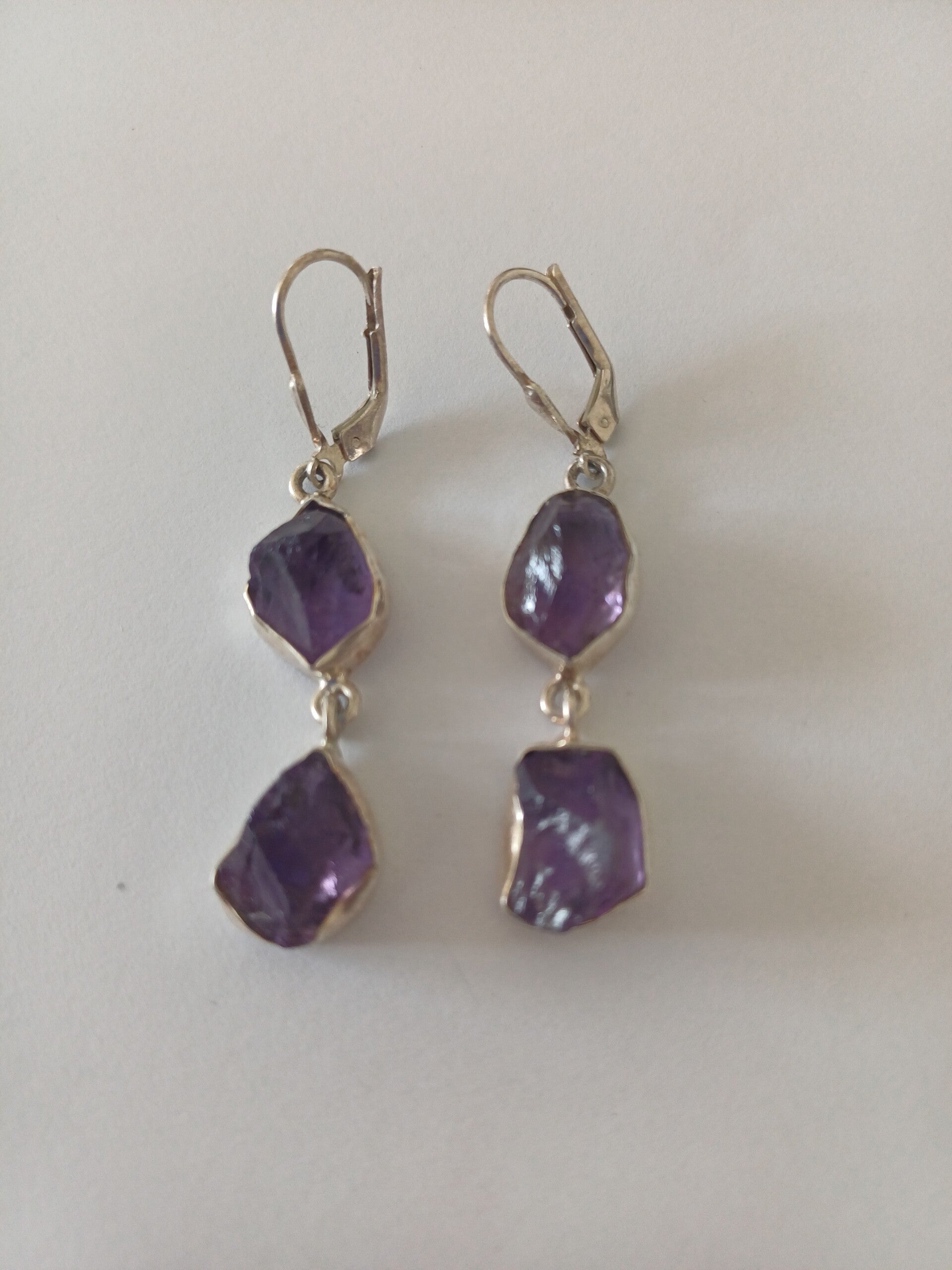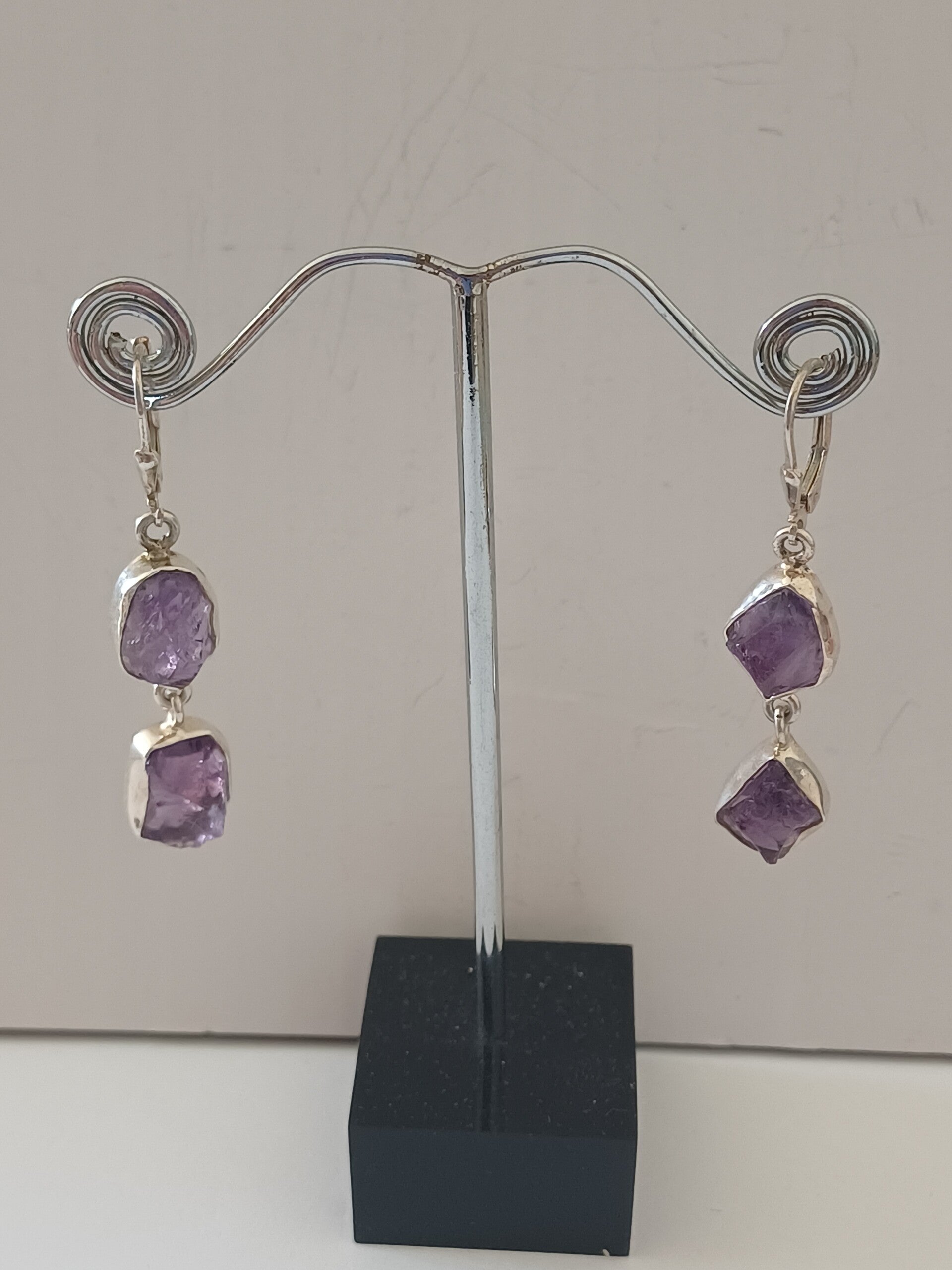 Dubbele oorbel in ruwe amethist gevat in zilver aan gesloten haak.