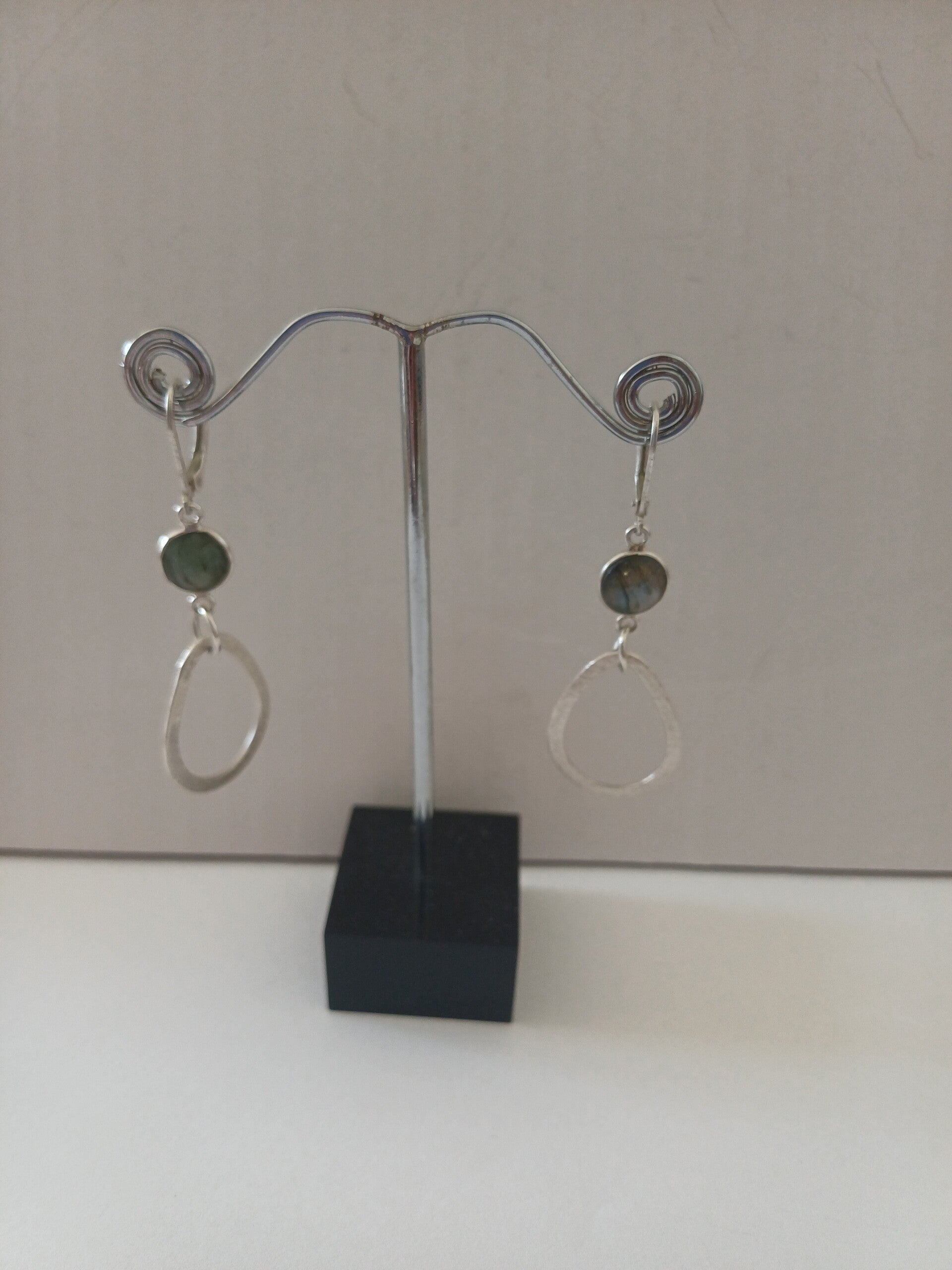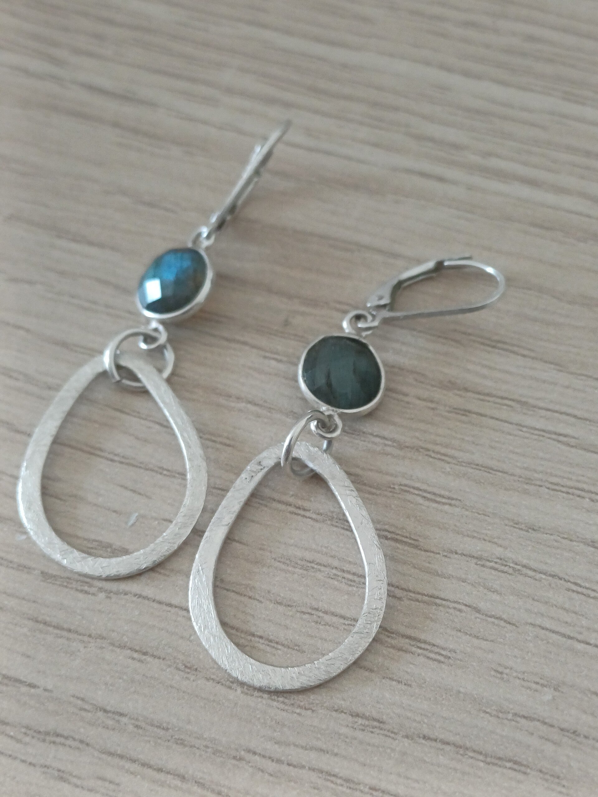 Elegante dubbele zilveren oorbel met rhodoniet of labradoriet en ovale hanger aan gesloten haak.