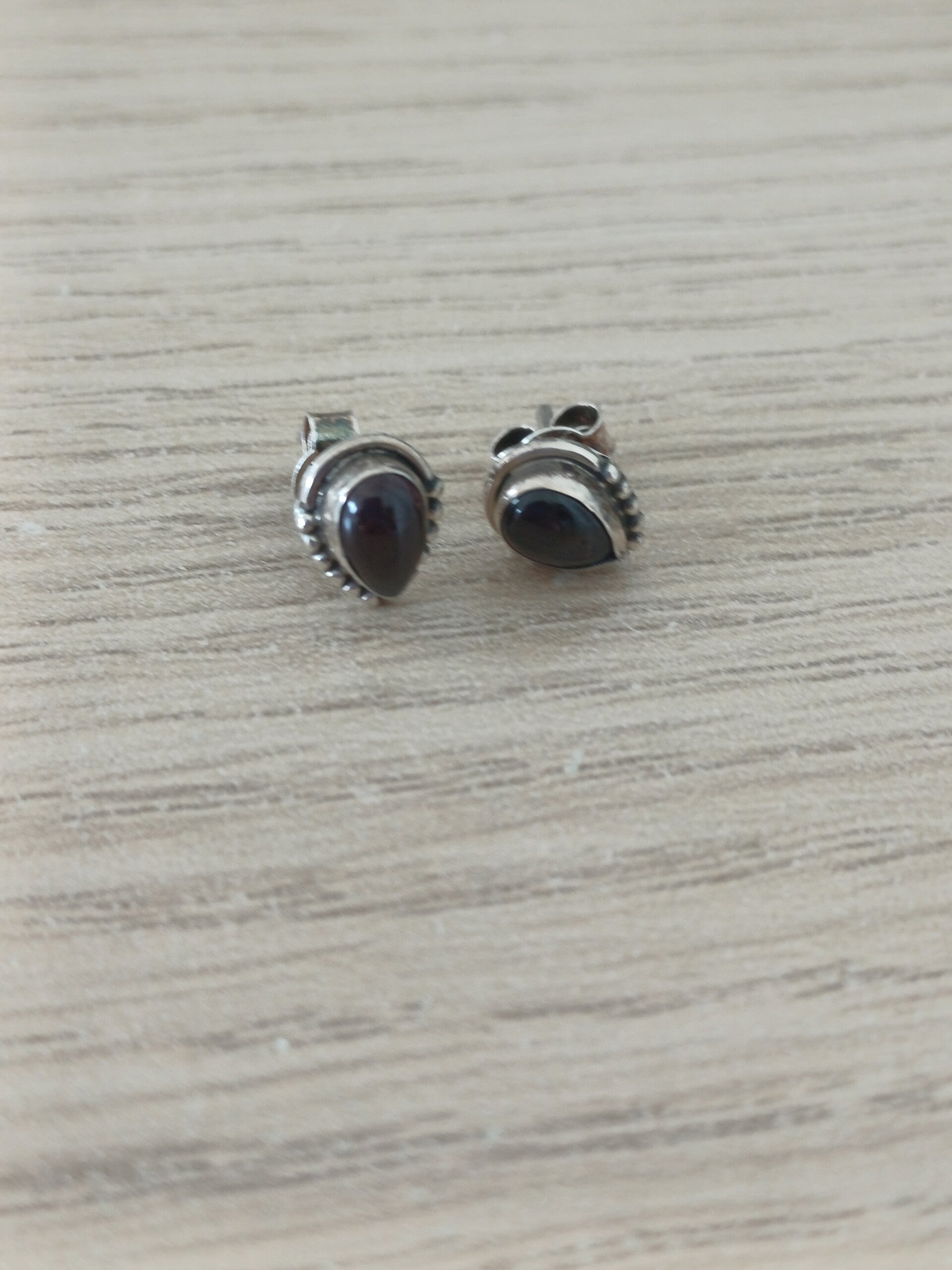 Kleine zilveren oorbel op steker in ovaal met gekartelde sierrand. Mooie dieprode granaatsteentjes.