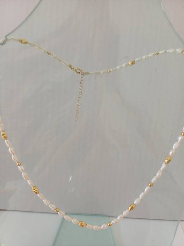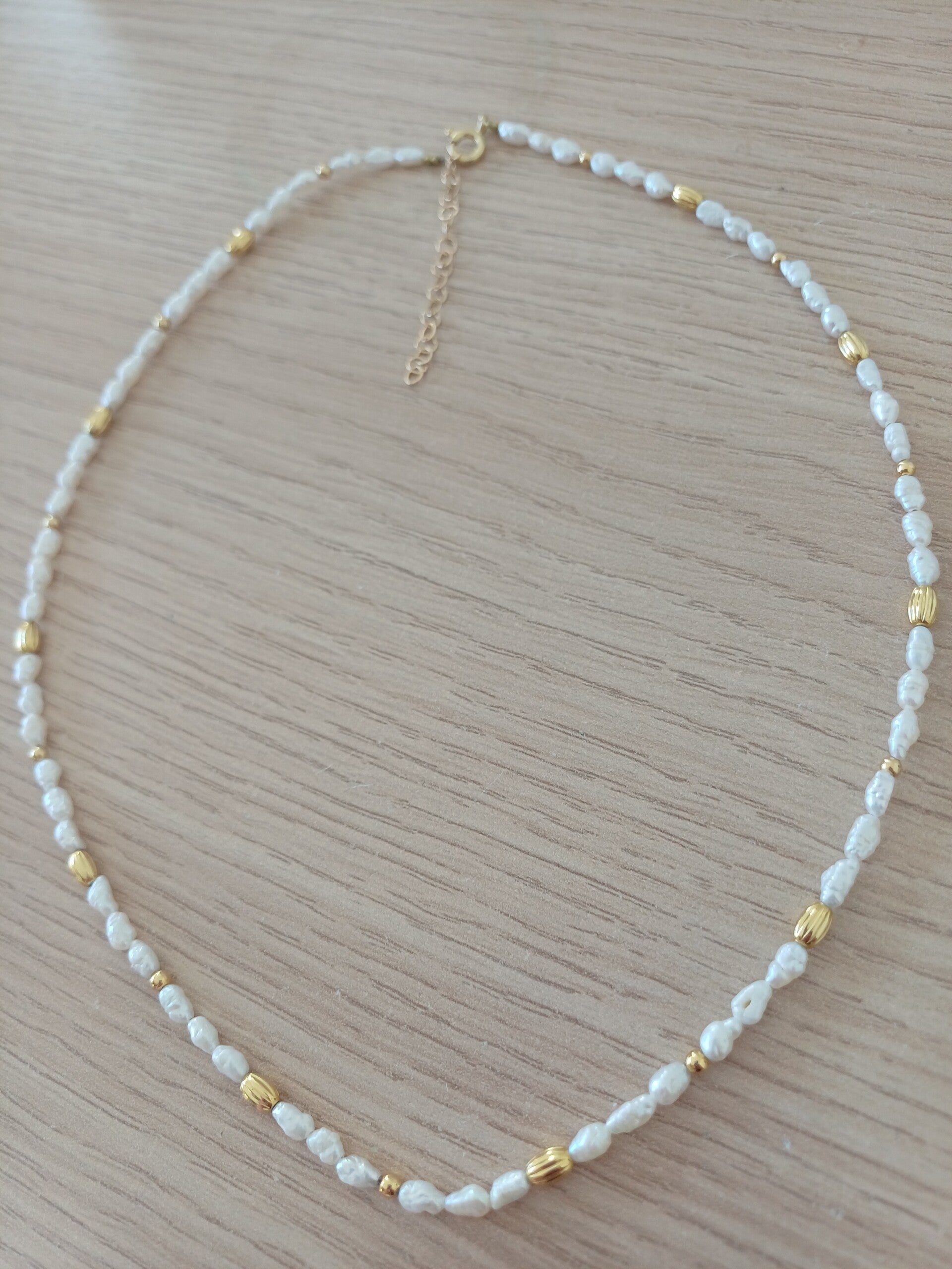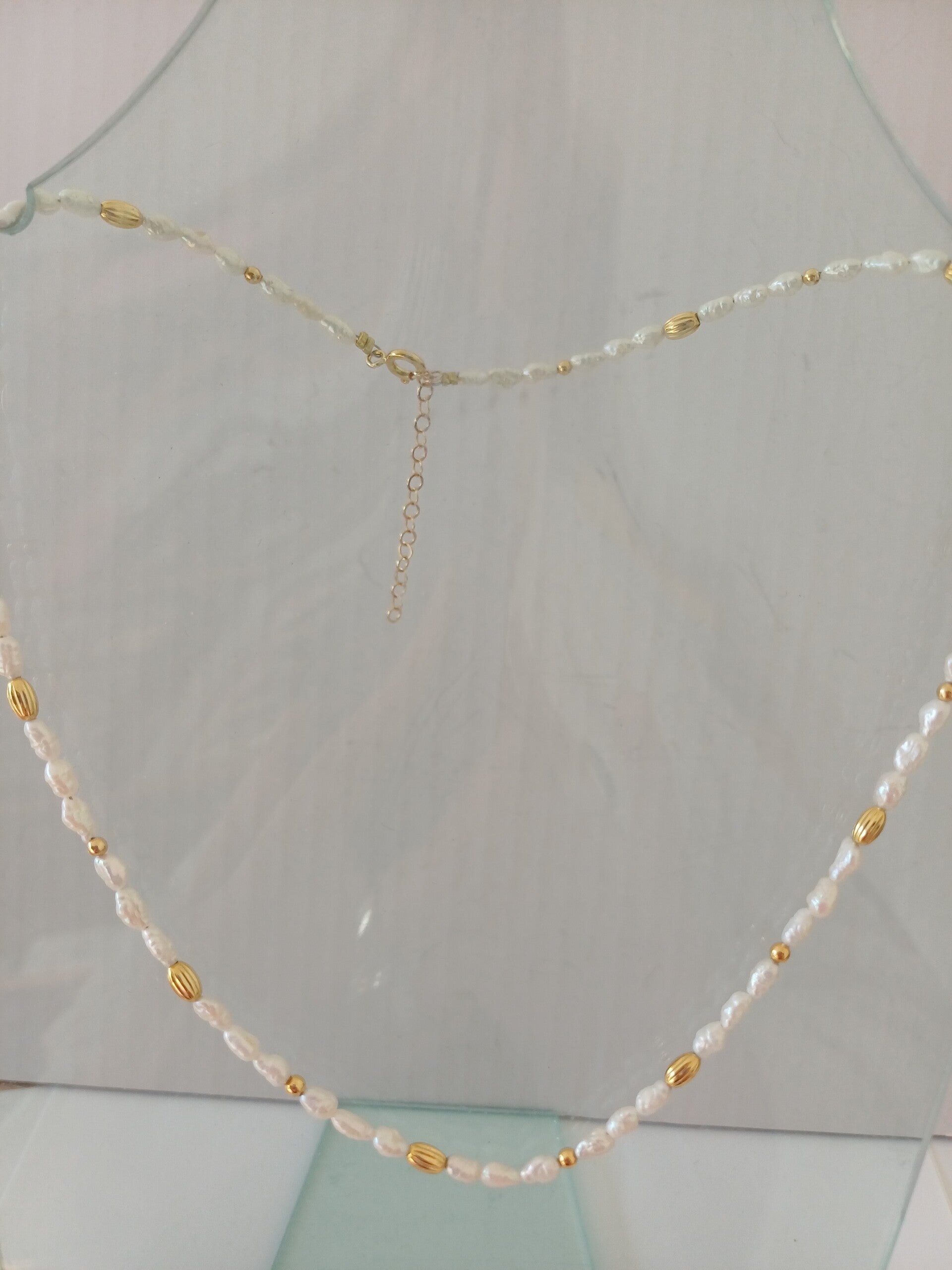 Fijn halssnoer met Japanse rijstpareltjes en vermeil kralen.