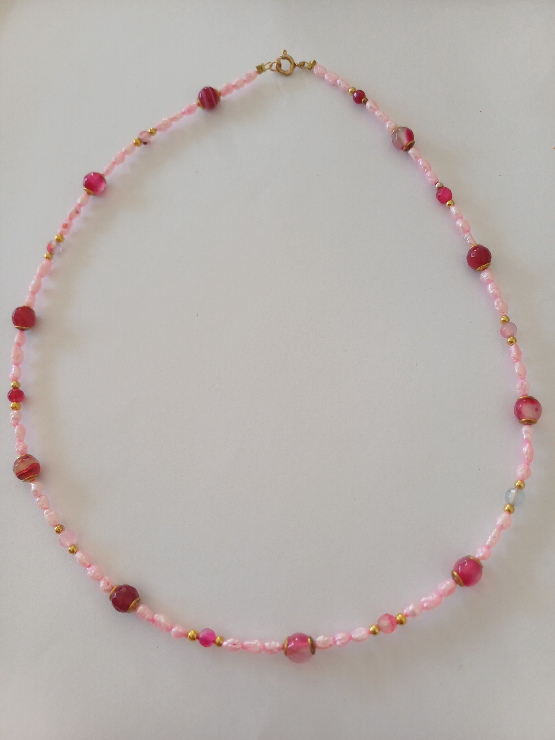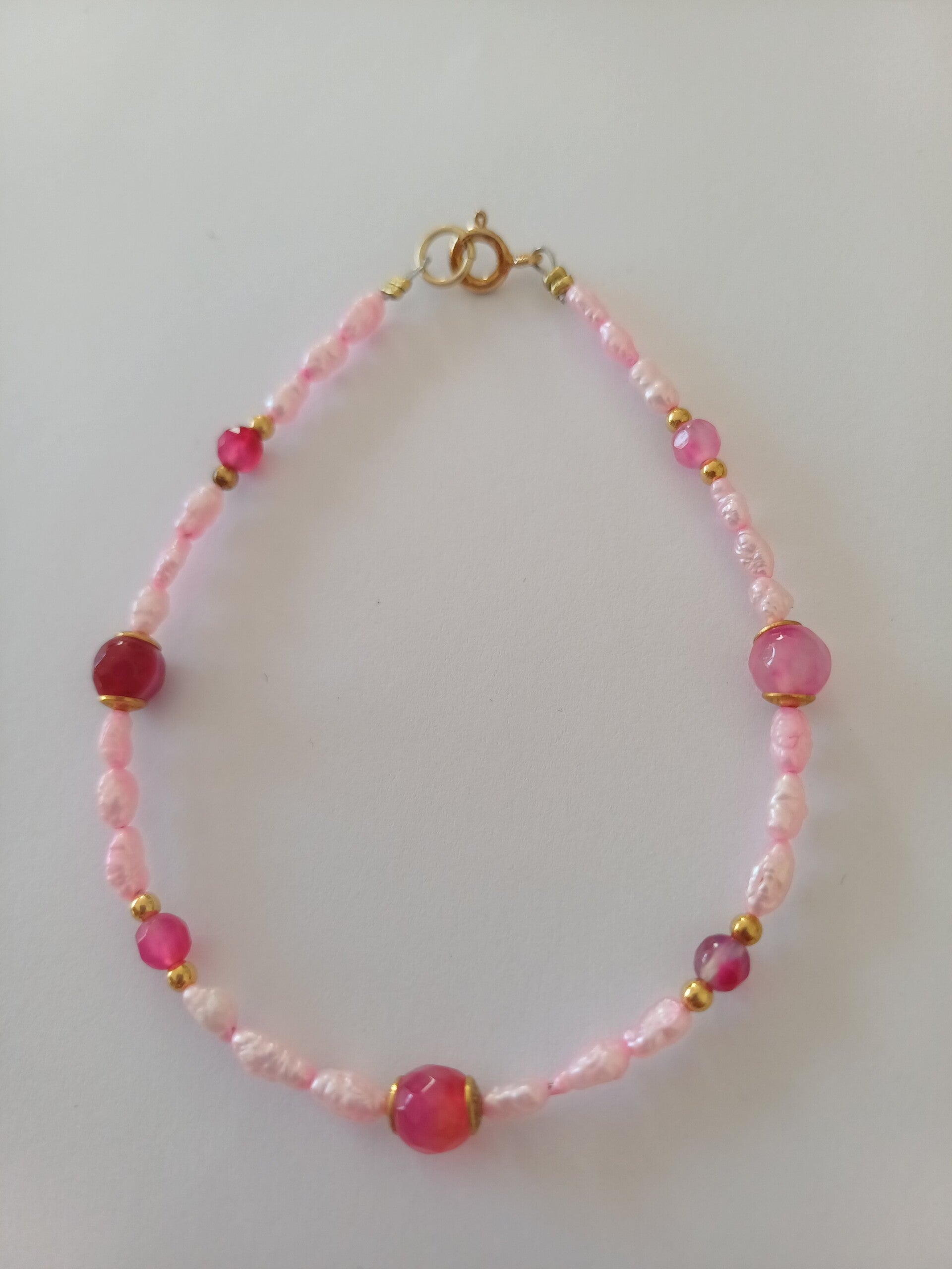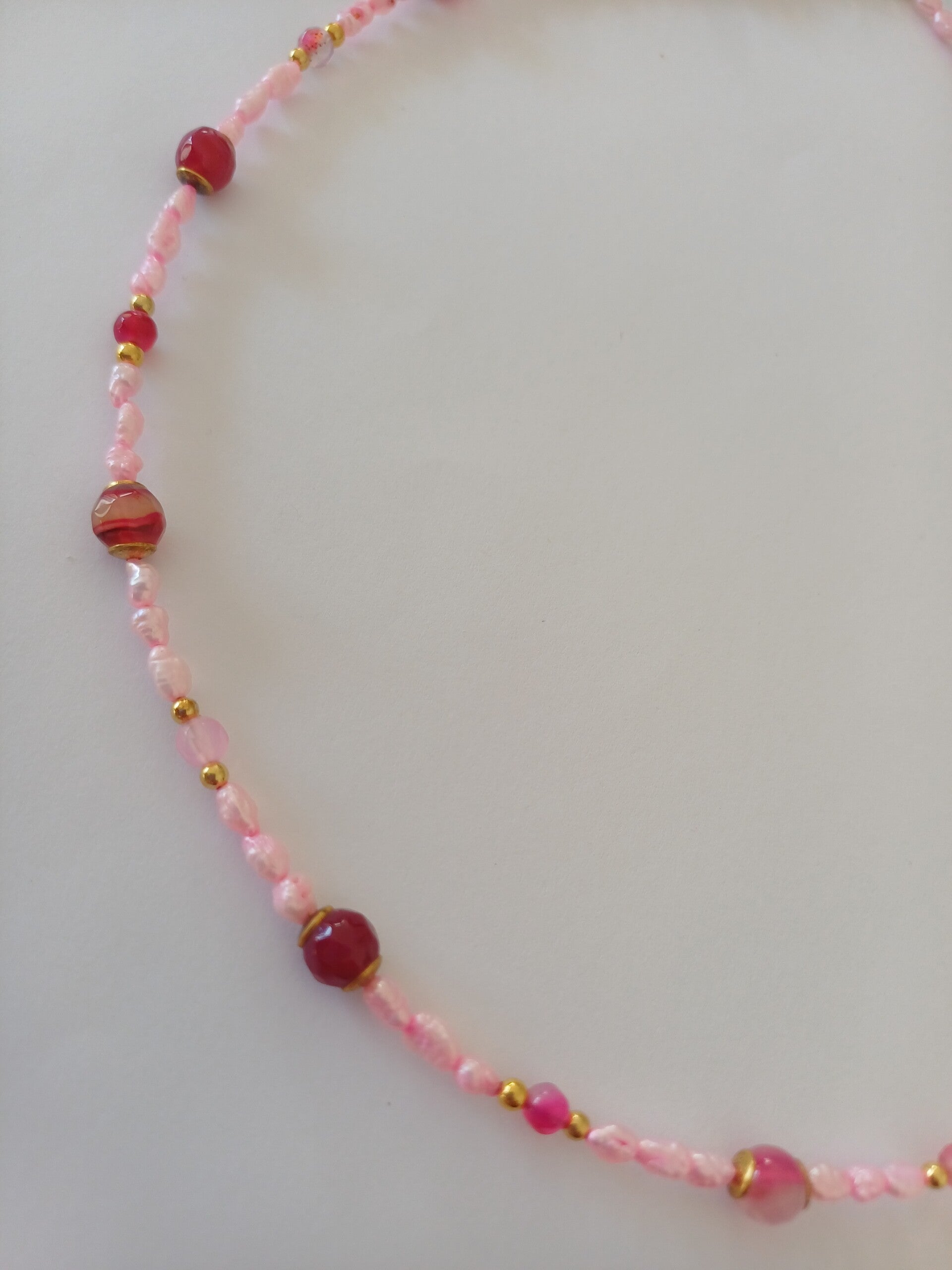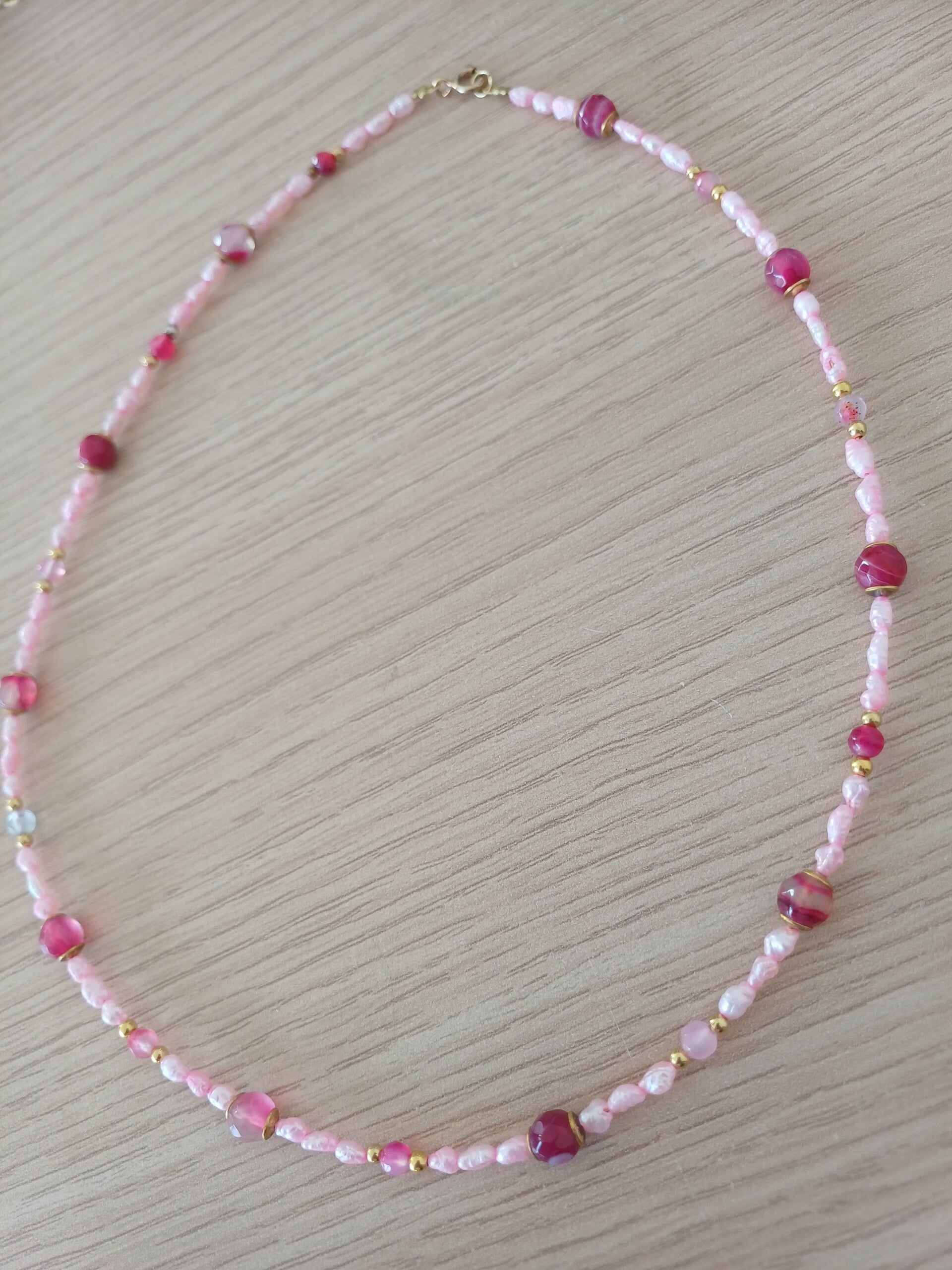 Fijn halssnoer met roze biwa pareltjes en kralen fuchsia agaat. Afgewisseld met vermeil balletjes en een veerringslotje.